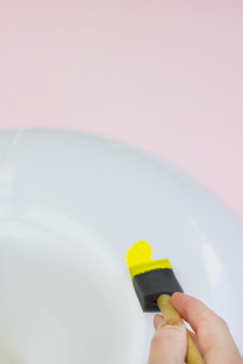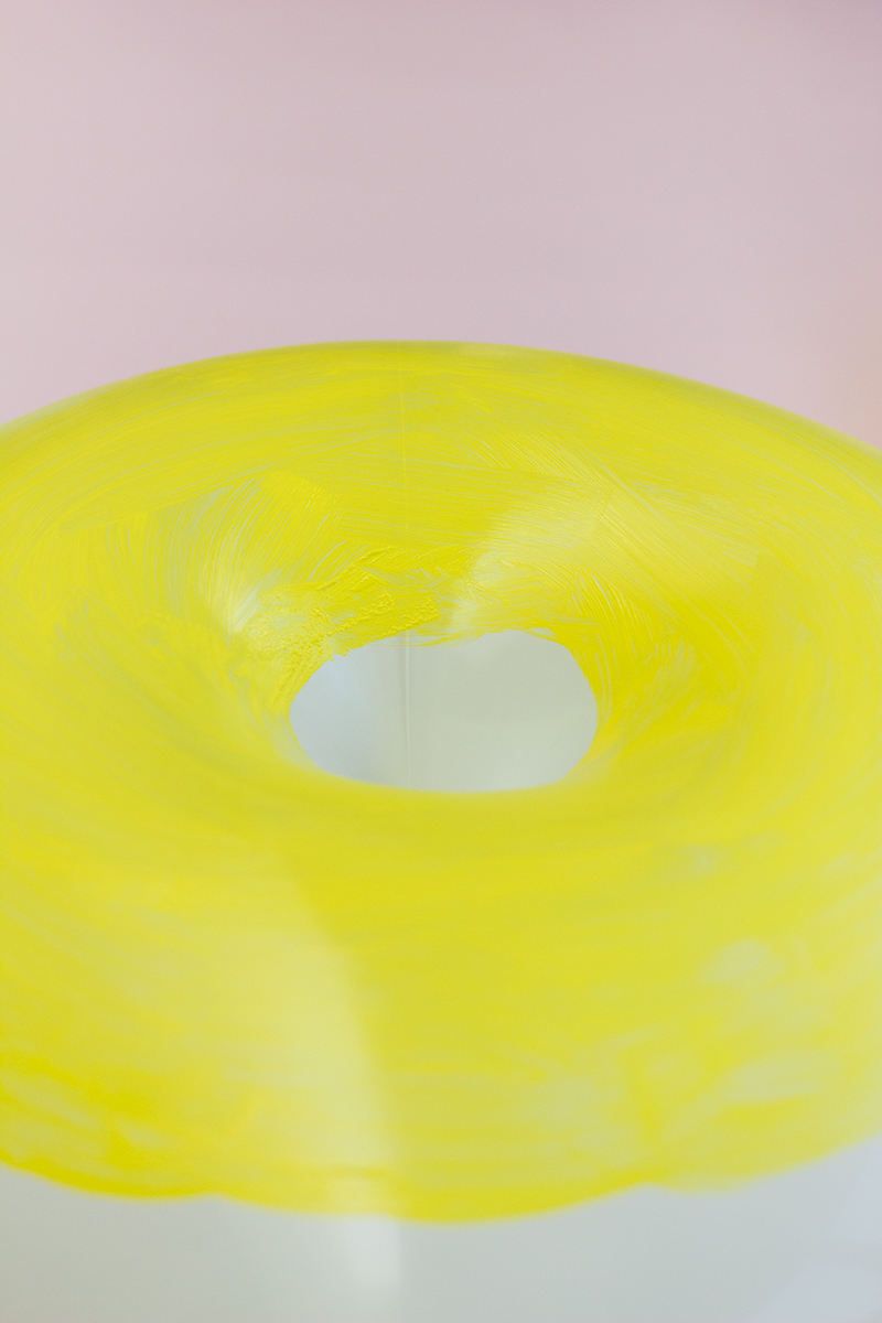To create your “frosting”, paint a rough circle of paint on one side of the donut balloon. Let dry and then paint a second, thin coat for better coverage. Let dry completely (the paint dries pretty fast on these balloons!).