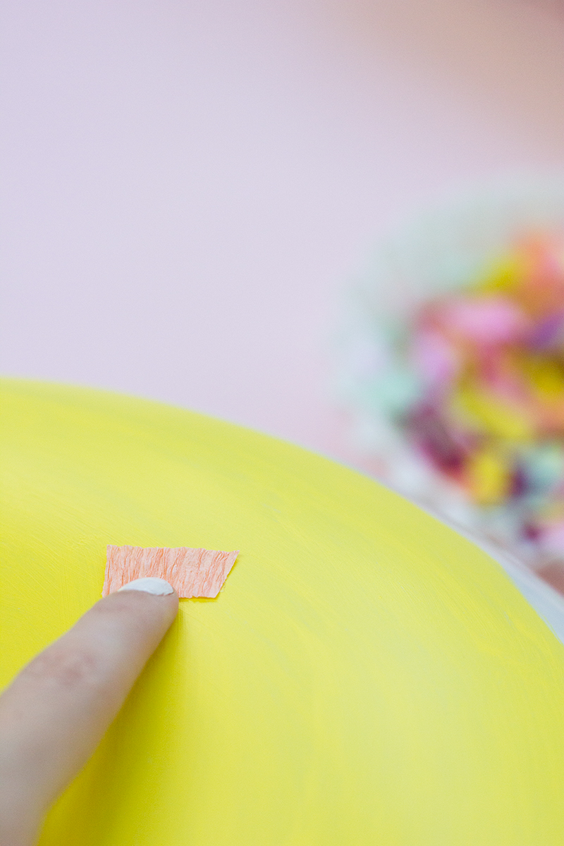 Add your sprinkles by adhering a piece of double stick tape to the back of each crepe paper “sprinkle” and adhering to the balloon.