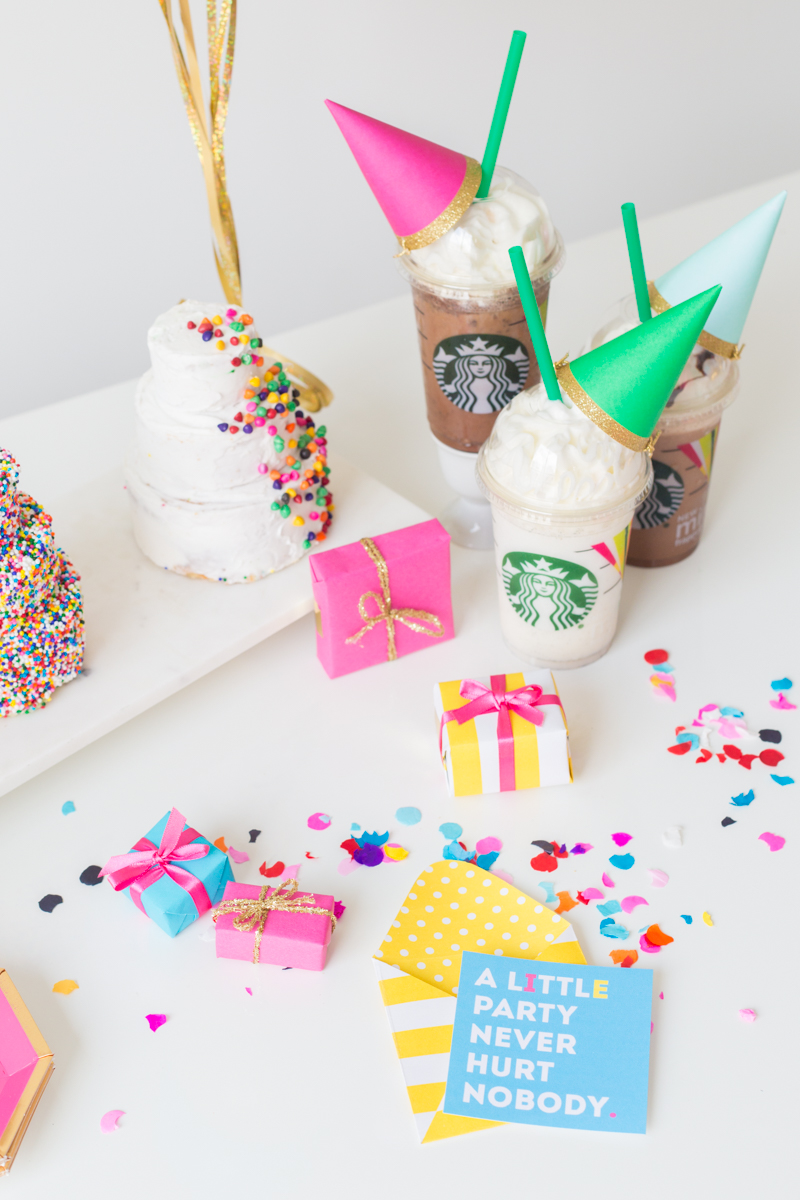 LOVE all of these mini party items. Those cakes and mini ice cream cones…perfect! And the party hats on the Starbucks cups too. So clever.
