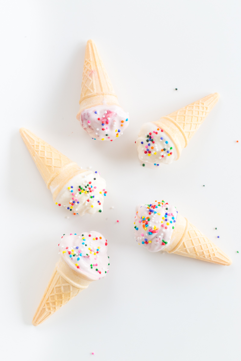 And we happily sampled ’em all alongside our mini cakes and mini cones. Yes, that is a tiny tiered birthday cake. We used this pan to make it and used a funfetti cake mix. To make the sprinkle cake, we popped the frosted cake in the freezer for about 5 minutes, then took it out and placed it in a 13×19″ pan. We then poured sprinkles on top of each tier and used a small icing spatula to press sprinkles into the side of each cake. For the ice cream cones used a melon baller to scoop mini scoops onto these teensy cones. THE CUTEST!