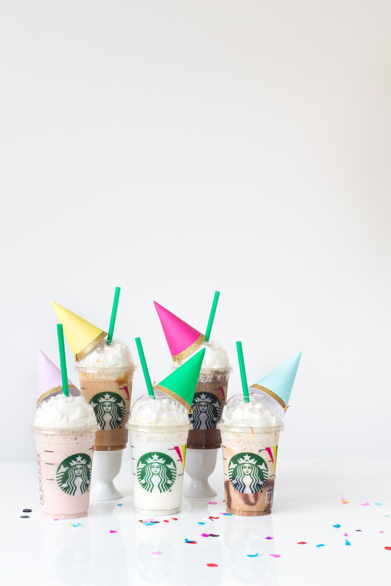 And now for the most important part, the treats! First of all, let’s talk about this mini Frappuccino. It’s a cute little 10 ounce guy and you can get any of the Frappuccino flavors in the new petite size! In case you couldn’t tell, I have decision making problems so I went with… all of them. And topped them with cute party hats for good measure.