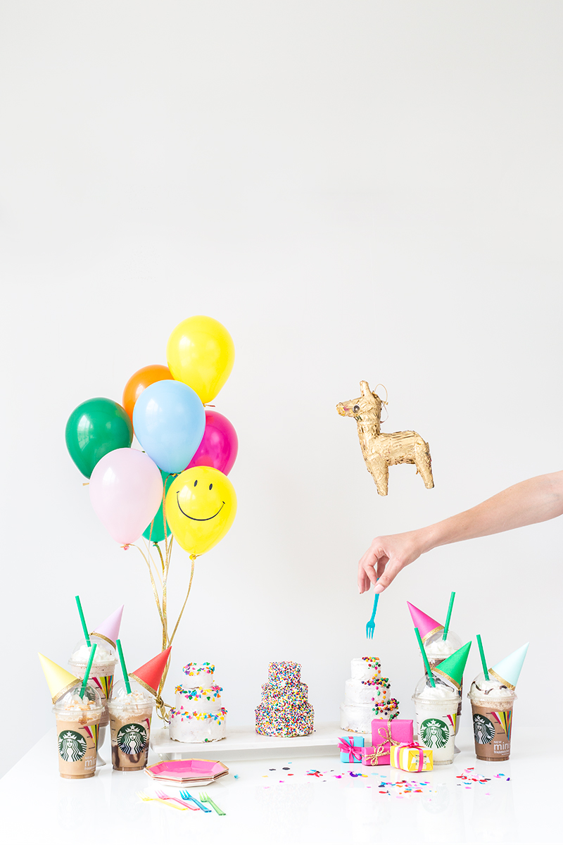 Honey, I shrunk the party! I am BEYOND excited to be teaming up with Starbucks for some crazy fun posts starting.. NOW. Because, in case you didn’t know… I live for mini-sized everything. So when Starbucks asked me to do a little somethin’ somethin’ inspired by their new mini Frappuccino, I was all, “You mean, you want me to throw my dream party?” I know I’m not alone in loving bite-sized everything, so how fun would it be to put on a party where everything, from the balloons to the cakes to the plates (!) to the piñata is itty bitty! That’s just what I did and I have all my tips for shrinking your party to off-the-charts cute proportions! Let’s do this.