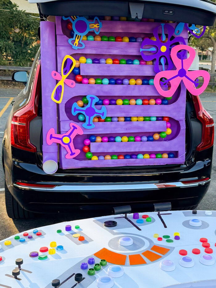 We love making our trunk or treat booths interactive! To do this for our Inside Out Trunk or Treat, we let each kid hit one of nine puck lights (one for each character in Inside Out 2) on the console and then they got to choose a color coordinated prize from a specific bucket.