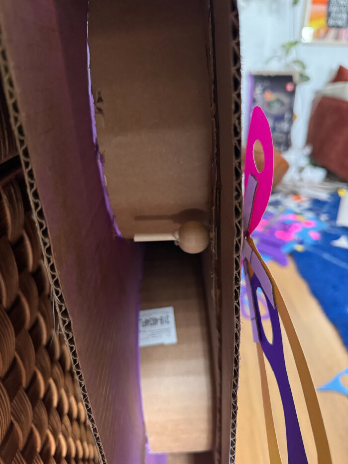 - Hot glue your 4″ wide strips along the curved tunnel you just cut out, bending the cardboard to follow the curves.